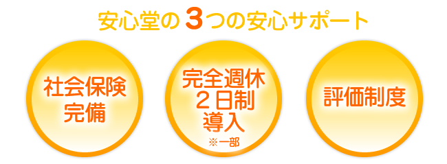 4 | 独立支援制度あり 技術を学び、独り立ち。でもちょっと一人じゃ不安と言う方は、後ろを振り返って ください。安心堂がいつでもあなたを待っています。 一人で悩まずご相談ください。あなたの独立をサポートします。 |